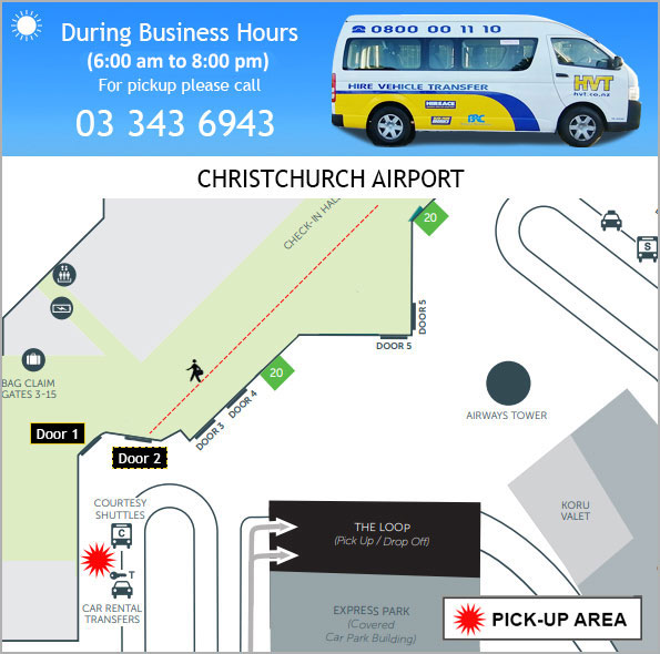 - Domestic & International arrivals – Our pickup location is located downstairs on level 0. With the Air New Zealand check-in behind you, exit doors 1 or 2. Look out for our Hire Vehicle Transfer Shuttle and one of our friendly staff will collect you. The Drive to our Branch where your vehicle is located is approximately 5 minutes.